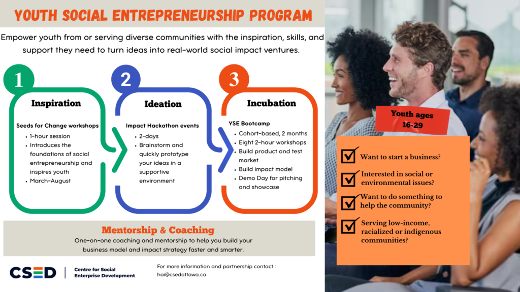 Offered regularly from March to August 2026, the webinar introduces you to the foundations of social entrepreneurship, including key definitions, the social enterprise spectrum, different models, and real examples of youth-led social enterprises in Ottawa, across Canada, and around the world. Webinars are 1-hour long and offered in-person and virtually.